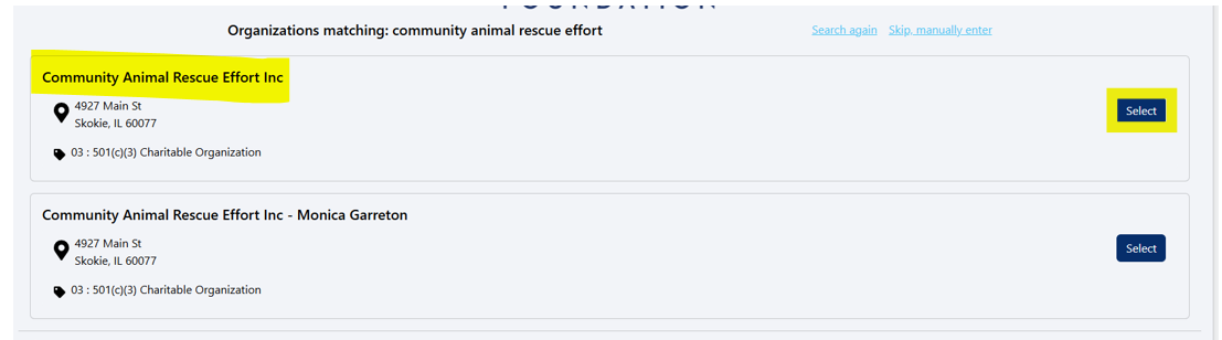 5. If your organization is new to our database and does not show up on the list, choose the “Skip, manually enter” option.